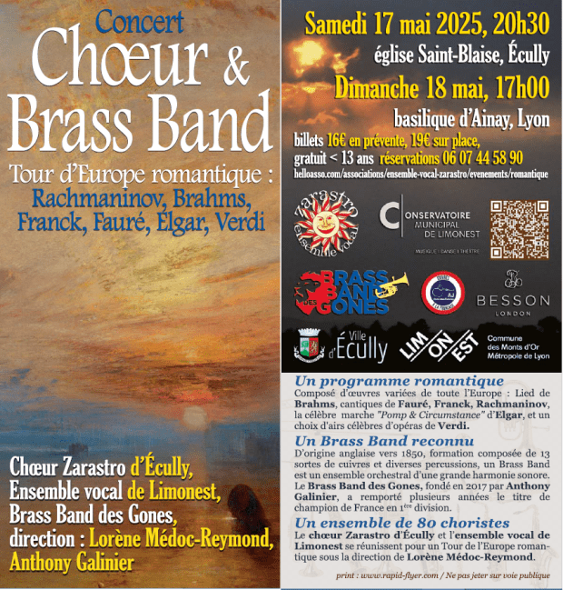 L’Ensemble Vocal Zarastro s’est associé à l’Ensemble Vocal de Limonest et au Brass Band des Gones pour un tour de l’Europe romantique, avec des œuvres d’Elgar, Franck, Fauré, Verdi, Rachmaninov, Brahms… Ces concerts donnés en juin 2025, ont été très appréciés, notamment grâce à l’accompagnement du Brass Band.